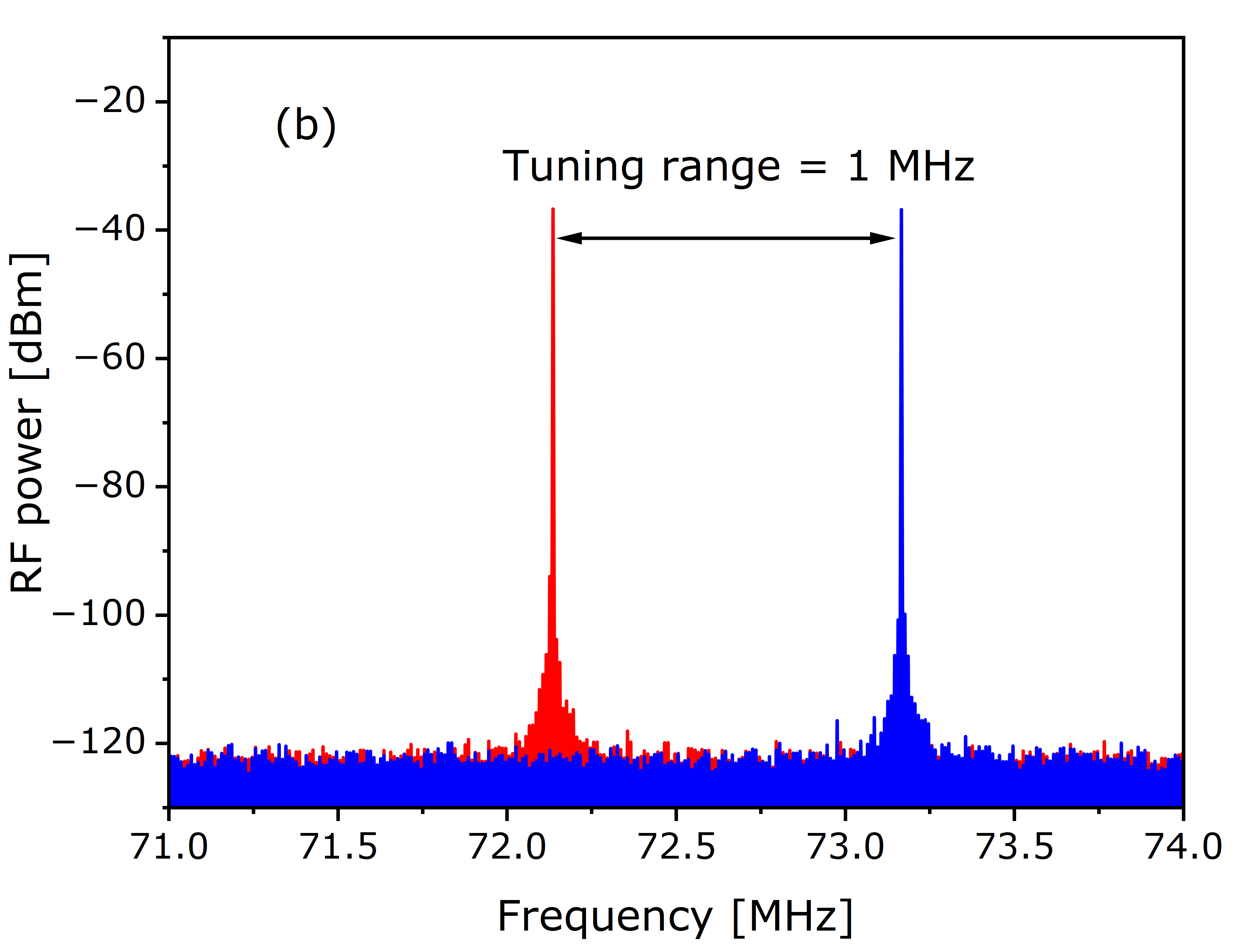 • RF spectrum of the oscillator’s output measured at two boundary settings of the intracavity delay line